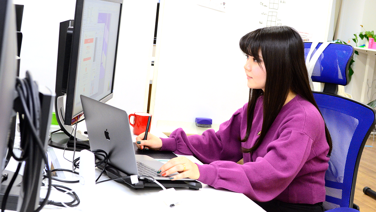 今はデザインに関わること全般を担当しています。エンジニアがコーディングから実装までやって、あがってきたものを確認して何px違うとか、動きが違うとか、デザインとのちょっとした差は見逃さないようにしています。