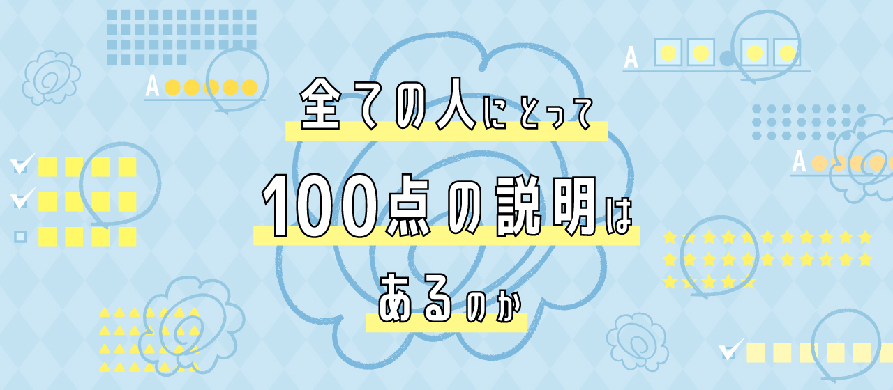 結論から言うと、全ての人にとって100点の説明はありえません。 同じ内容が100点になることはないという意味です。 すべての人にとって合格点(70点以上)ということはできると思いますし、目指すべきラインだと思います。